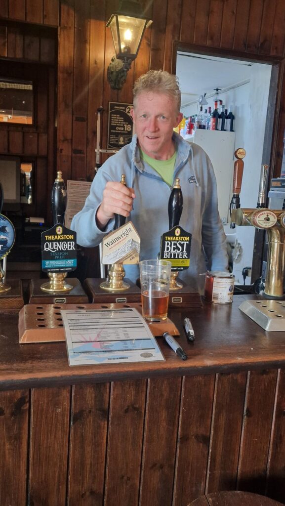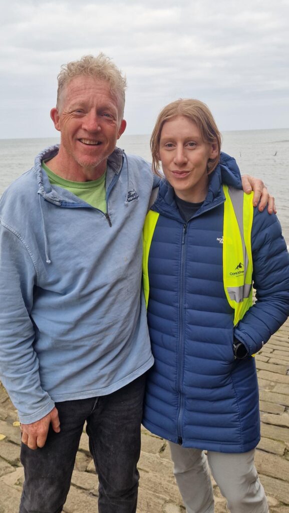 With Sue now in the care of the Community and me marching to the Centurion beat I felt at home in both groups. I loved Centurion’s intention and delivery of a raw and pared back traverse and also had the luxury of seeing Kitty and David’s online omnipresence become real. There was David rushing around making tea and handing me pizza and potatoes in Shap’s Memorial Hall (secured by Keiran, staffed by volunteers). And, as later revealed in runner blogs ‘suddenly Kitty popped up to guide my tired steps across the busy A19’ was typical. There again were Kitty and Sarah videoing the Community Traverse finishers, capturing my friend Sue as her pebble splashed into the frothy grey North Sea. We were stood outside the famous Wainwright Bar, also secured by the Community as a dry space to change at the end of the route, and sign the C2C book. Congratulating Sue and climbing the road, I soon found David, still somehow standing. The Swyft van had just dropped off the last few bags for those who had used that system.